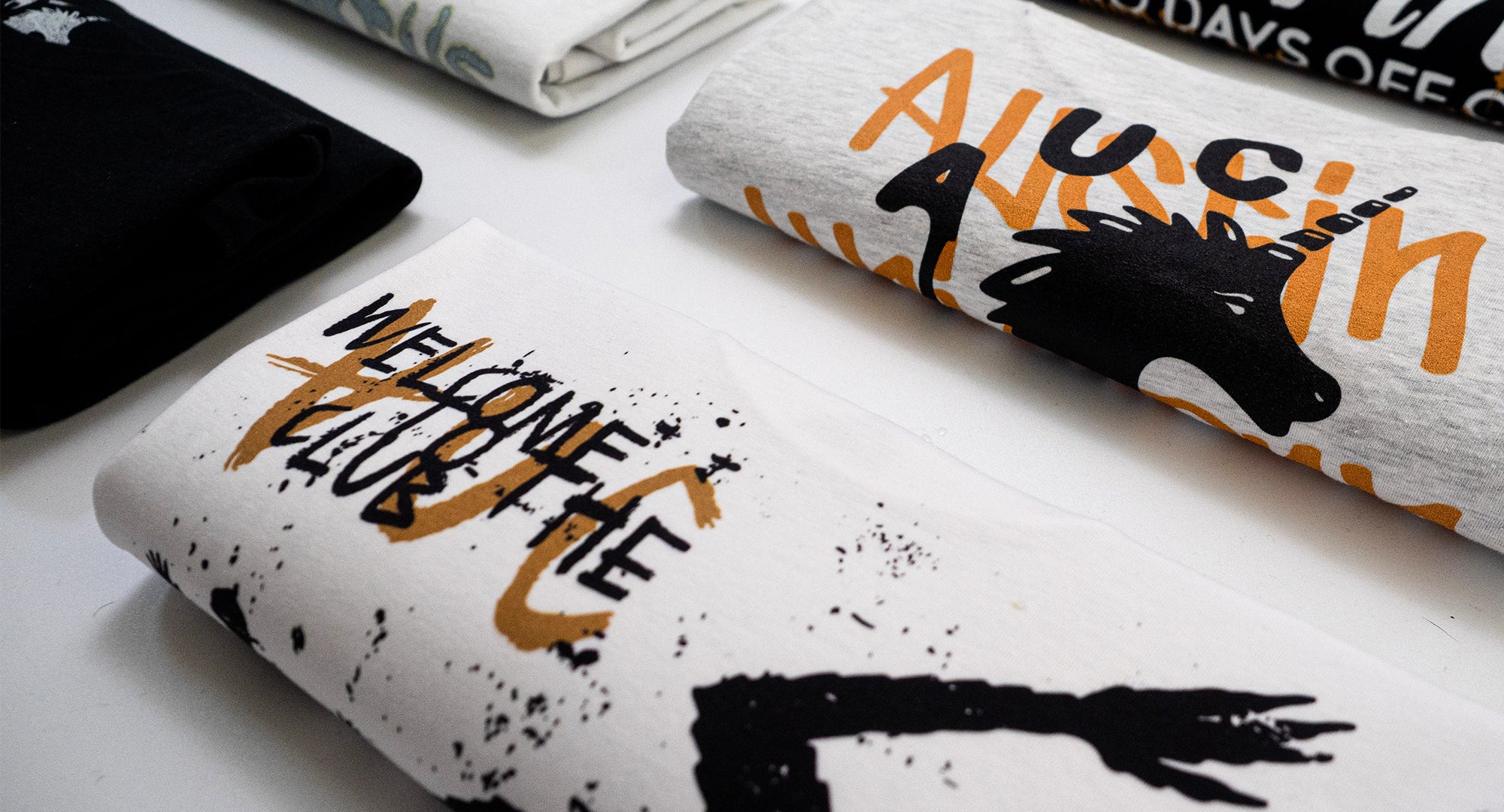 A collection of various printed AUC lightweight tees with different designs and text on a white background.
