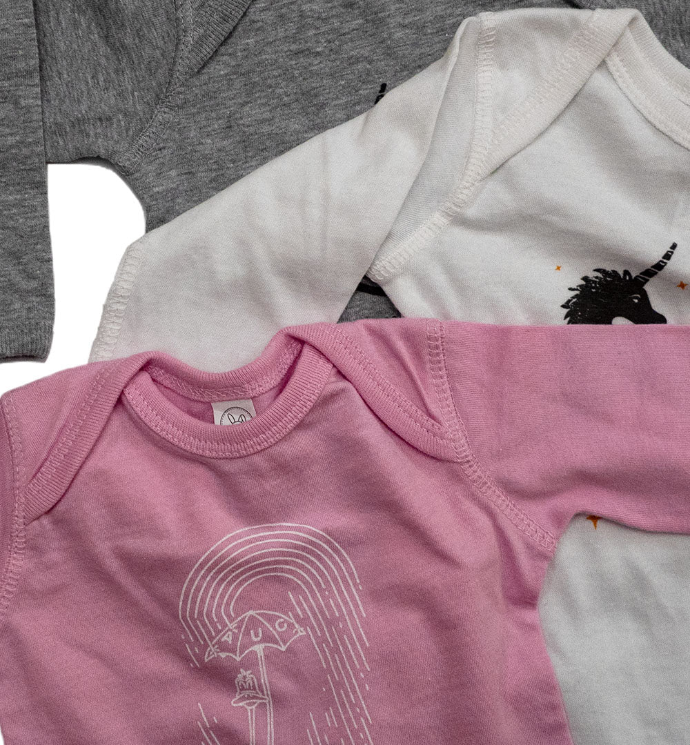 Austin Unicorn Club’s Short Sleeve Baby Onesies feature original graphic prints on soft, breathable jersey cotton for everyday comfort. Designed in Austin and printed in Texas, each onesie is made using Rabbit Skins 4424 blanks with 100% combed ring-spun cotton (or cotton-blend heathers) for a gentle feel against sensitive skin. These baby bodysuits include lap shoulders for easy dressing, a three-snap closure for quick diaper changes, and reinforced binding for durability. With playful, custom-designed artwork and quality construction, this collection is perfect for parents looking for funny baby clothes, unique baby gifts, or matching outfits for the whole family.